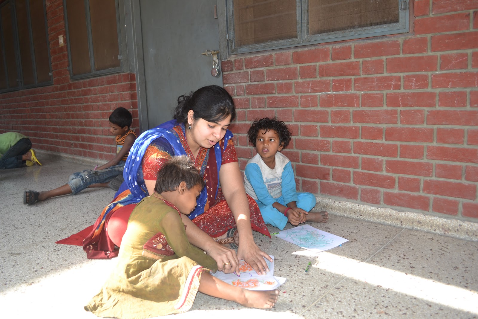 The youngest group of children sat down for drawing and painting. They drew no. of objects and figures and coloured them with crayons with teacher Savita.